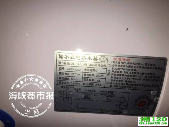 从家属提供的涉事热水器的照片中,记者看到,该电热水器是“新飞”牌,商标持有人为“河南新飞电器有限公司”,而脱落的接头刚好是热水的出水口,且事发后,热水器呈倾斜状。