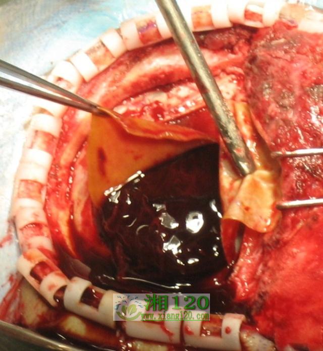 剪开硬膜后,暴露的血肿包膜(淡黄色)及血肿