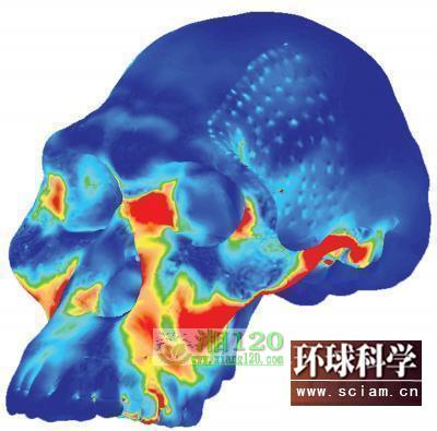 此图为非洲南方古猿人头盖骨的应压力图。非洲南方古猿是一种已经灭绝了的早期人类,他们用前臼齿撕咬东西。图中鲜艳的颜色与高压力有关。