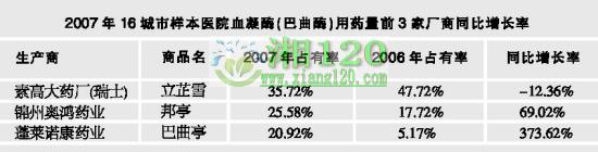 在我国医院止血药市场中,血凝酶是市场份额最大的药物,占据了60%以上的份额。蛇毒类血凝酶主要由巴曲酶及微量的凝血因子Ⅹ脂依赖性激活剂构成,具有速效、高效、长效、安全、方便,且不受血浆凝血酶抑制剂影响的诸多优点,尤其对脑外科中的手术创面渗血有明显的改善作用,并广泛应用于出血性疾病。国产血凝酶开发上市后,逐渐侵占医院市场,也使血凝酶市场呈现出快速增长的态势,近5年的年平均增长率达到了38%。2007年国产血凝酶在样本医院中的份额已从上一年的49%增长到61%,而2008年上半年,在血凝酶快速增长下,瑞士素高药厂的“立芷雪”的市场份额为28.76%,国内产品占据了71.24%。