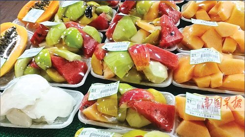 在市内多家超市,记者都发现了这种将水果切片包装的果盘。无一例外,这些果盘里的水果,看起来都像是刚刚切的。