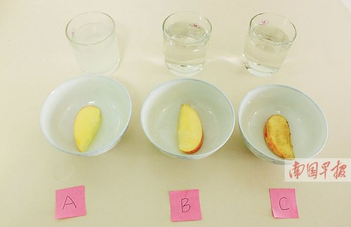往玻璃杯中各倒100毫升纯净水,A杯放入维生素药片,B杯放入食盐,C杯为纯净水。搅拌制成溶液后,将洗干净的苹果切出大小相当的果片依次投入,浸泡十分钟(如图二)。随后,将浸泡过的果片甩干,依次放入对应的A、B、C三碗,用保鲜膜封口。6小时后,再切开一只苹果,和碗中苹果进行颜色对比。