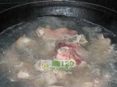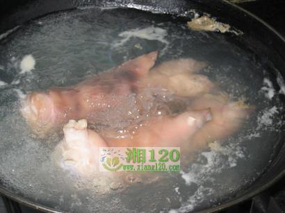 2、大约半小时后,将猪手从沸水中捞出,此时的手感已颇富弹性。这时,将猪手砍剁成块,再烧一锅白水。