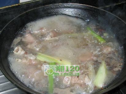 - 3、 锅内水已烧开将已成块状的猪手丢入锅内,继续烧煮,以去除血水。此时需要加入生姜片,葱段,八角,花椒,绍酒,少量的味精与盐,目的仍然是去除猪手的寒气与腥臭。