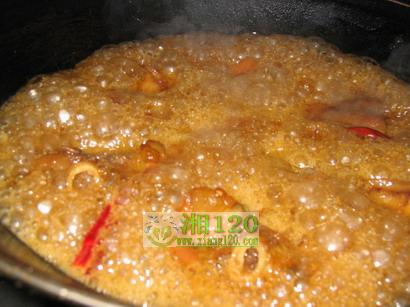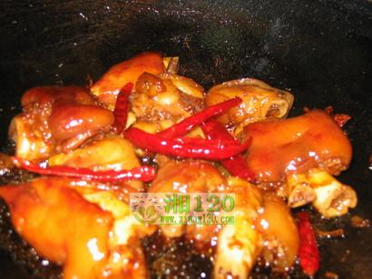 随后急火烧热新油,以姜丝葱花儿煸炒出香味儿,下入煎炸过的猪手块,然后加入冰糖,绍酒,味精,盐,红辣椒,八角,香叶,少许的酱油煸炒片刻,加入适量的清水,使材料刚刚没及猪手,然后文火靠汁儿。