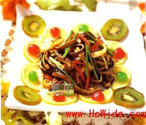 1、鲜鱿鱼、鳝鱼肉、香干、红椒、生姜全部切丝,韭菜花切段。为食街