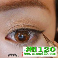 Step4 用金咖啡色的水性眼线笔,再描一次上眼线,从眼头出发、在眼珠上方开始慢慢加粗(约双眼皮的1/3宽),眼尾稍微拉出一点弧线,加强电眼感。
