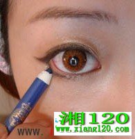 Step5 日本彩妆大师推荐,带明显亮粉的蓝色眼线笔,轻描下眼尾1/3,可怜度和媚惑感激增。