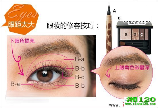 选取带有米色(a)、卡其色(b)、深棕色(C)的眼影,在整个眼窝处用米色(a)涂上底色;然后在上眼皮靠近睫毛的1/2处重叠使用卡其色(b)并模糊界限;眼皮与睫毛相接处使用深棕色(c)收紧眼部线条。此时,由于眼部使用深色,可以掩饰双眼过于分离的缺陷,让眼部、鼻部都更加紧凑。,还需要棕色眼线笔修饰眼部轮廓,在下眼线的位置使用卡其色(b)眼影,下眼内眼角处在淡淡地使用一点高亮的米色(a)提亮。