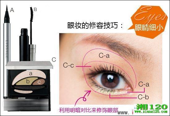 眼睛太小是很多MM的烦恼,经常被人嘲笑“蒙猪眼”让自信大受打击。其实,只要学会使用棕色眼影的明暗对比来修饰眼部,将瞳孔上方的睫毛涂得浓密、翘长,就可以让眼睛变得开阔、有光彩,而且显得自然。,还可以使用一点浅浅的灰绿色,让整个人显得清爽、可爱。
