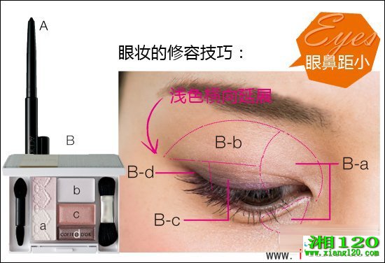双眼与鼻梁之间位置太近,会给人很拥挤的感觉,也会带给别人“斗鸡眼”的印象。这个时候需要在眼部使用高亮的眼影,由内向外横向淡淡地上眼妆,利用浅色来横向延展,可以从视觉上让眼部与鼻梁的距离打开,并显得柔和,亲切。