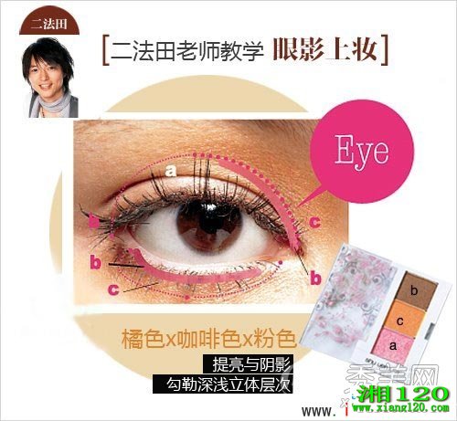 眼影:眼影以橘色和咖啡色为主,为了让眼睛更有神采,眼部更明亮,需要加以带珠光效果的、高亮度的粉色眼影。
