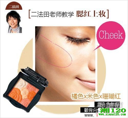 腮红:腮红选取以橘色为主,配以米色,珊瑚红混合胭脂,能够让整个妆容显得柔和,典雅。胭脂选取滋润度高,带有珠光效果的。