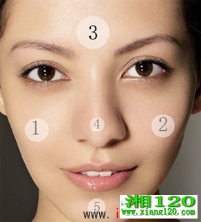 用手指在全脸点上5点粉底,按照1、2、3、4、5的顺序涂匀。