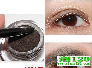 3、用深卡其色眼线膏涂抹真个虚线区域,稍微超过眼影底色的区域,用手指、棉签等将眼影晕开。