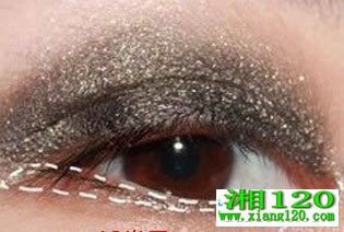 4、在虚线表示的区域画上下眼影,然后用卡其色眼影薄薄得打在整个眼周防止晕妆。