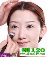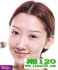 Step2.在额头、脸颊和下巴分别涂上适量液,用粉底刷从中间向两边均匀推开。