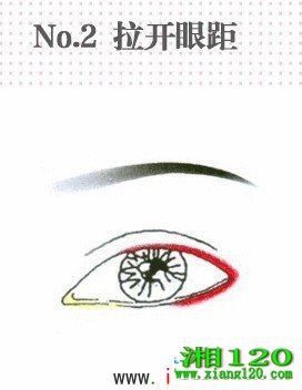 还可以在图上所画出的眼头处淡黄色部分,加上一些诸如白色系、浅肤色或浅金色之类的高光色,也可以起到拉大眼距的作用。