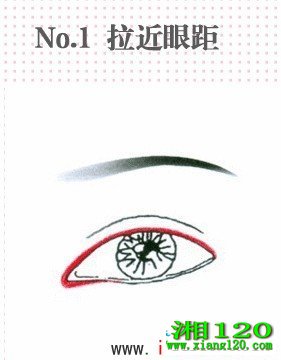 想要起到拉近眼距的效果,在画完完整的上眼线的,还需要在眼头将眼线自然连接过渡到下眼角的约1/3处,才能起到放大眼角、缩短两眼间距离的作用。