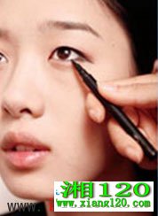 Step2.从眼头部位开始描绘下眼线,在眼尾处和上眼线完全结合,并用眼线液将眼尾三角区全部填满。可以加深眼尾眼线的颜色,这样能够很好地拉长双眼,并突出楚楚动人的清纯感。