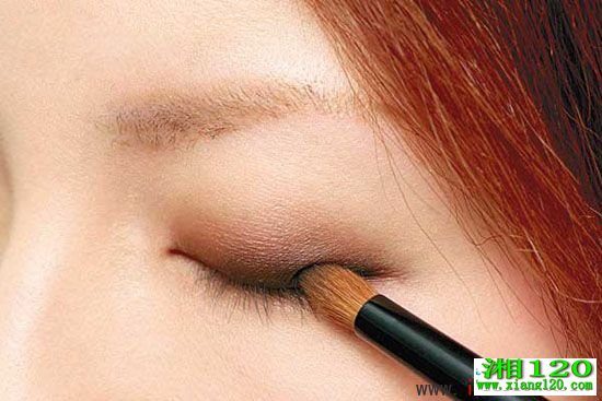 Step 1、于眼窝位置扫上浅啡色眼影打底,注意不要高过眼窝,之后于接近眼线的位置扫上深啡色,中间用扫Blend匀。