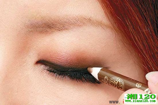 Step 3、画上黑色眼线,眼尾部分拉长并向上翘,之后画下眼线,注意要填满眼眉三角位。