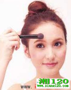 用刷子蘸取高光粉,在额头、眉头、鼻梁的T字区轻轻刷上一层。
