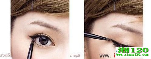 第五步. 接着下眼线处,要从眼尾往前,沿着睫毛根处仔细描绘出1/4下眼线,注意!眼尾一定要相连。