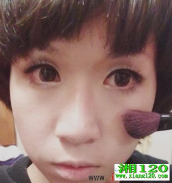 第五步:用腮红扫沾取浅粉红腮红扫在苹果肌的位置,淡淡晕开。