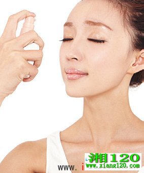 在脸颊喷洒保湿喷雾,缓解紧绷肌肤。