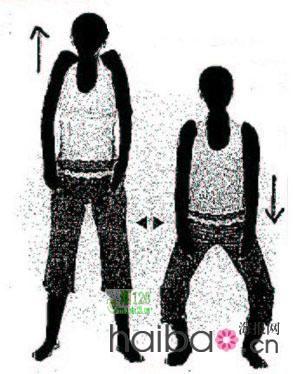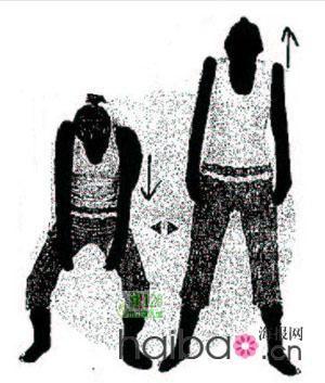 双脚张开与肩同宽,脚尖向外30度,双手自然下垂,然后利用膝盖的弹力自然且有韵律的蹲下、起立。