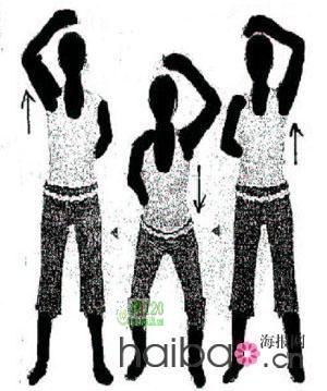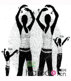 坐在地板上,脚跟併拢双膝打开。双手交扣放在头后方,尽量向后伸展,然后向左右侧弯各15秒。