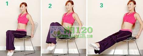 Step2:曲肘,双腿夹紧,大腿用力将双腿抬起向胸部靠拢,注意身体与椅子最好呈60度角左右。注意保持匀速呼吸。