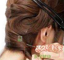 3. 上半部的头发和下半部组合在一起,扭转到颈部侧边,固定住。