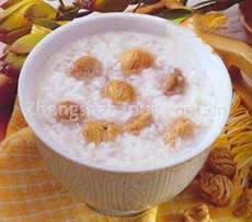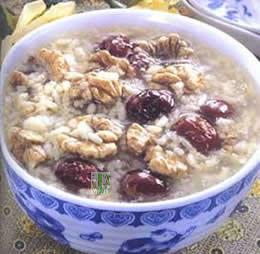 (6)胡桃粥:取胡桃仁捣碎同粳米同煮,有补肾、益肺、润肠的功用。胡桃肉20克、米100克。核桃肉洗净,放入锅中,同米煮粥,大火煮沸,转用文火熬煮至熟即成。常食核桃粥,不仅能补肾,还可以预防阳萎、遗精,有延衰抗老作用。