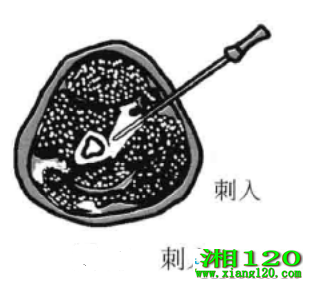 刺入即在加压分离的基础上继续加庄,当感觉到有坚硬感时说明刀口下皮肤已接近骨质,稍再一加压即可剌破皮肤,此时进针点体表凹陷基本消失,重要血管、神经及肌纤维膨起在针体两侧,可以根据治疗需要施行各种手法。
