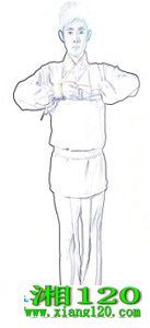 (4)腰部转回,面向正前。左挽5次,然后右挽5次,恢复起式。
