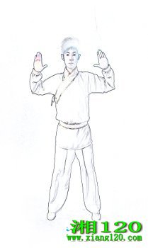 (3)双手前推,双眼圆睁。双足足趾尽量上翘。保持此姿势一段时间。