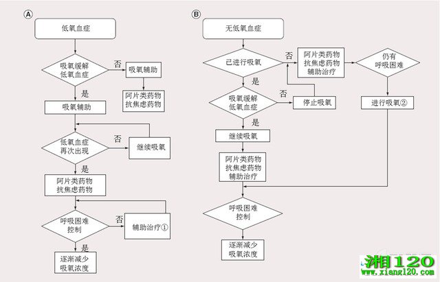 应通过高流量供氧设备提供高流量氧疗。若纠正SpO2后呼吸困难仍存在,可联用阿片类药物来缓解呼吸困难。