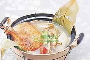 瑶柱鸭汤:用冬菇六粒,瘦肉四两,鸭半只(人多用一只),江瑶柱六粒(大)。把鸭肉切洗净,去肠杂,瑶柱冬菇先浸至透,将以上各物一齐放入瓦煲,六至七碗水,煲四小时以上。鸭肉味鲜,蛋白质丰富;瑶柱乃海产食物,滋阴入肾;元肉为温补要药,温中逐寒。凡上热下寒者饮此汤相当适合,配瘦肉、冬菇使此汤更加清甜而温补。