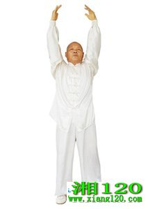 2.两掌向体侧前上托至视平,经体前内合下按。两臂上托收腹吸气,下按松腹呼气,大周天,参见起式。