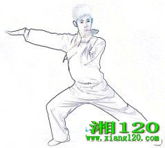 (4)左手推颈左转的,右手转掌向上,右膝屈曲,成侧弓步。